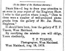The appearance in the news of Tinson as a photographer comes in 1873, when ‘admirably executed photographs’ featured in the Northern Agricultural Association’s Show at Singleton in August of that year. Tinson did, however, correct the Maitland Mercury correspondent on an error in the report. [2]